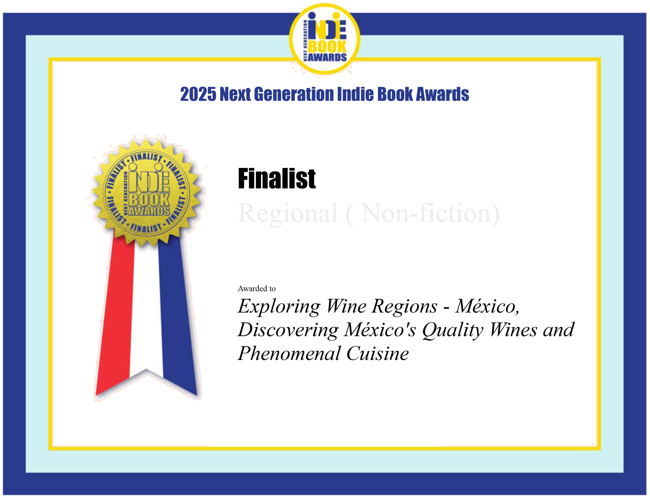 Exploring Wine Regions – México was honored by the Next Generation Indie Book Awards as the Second Best Non-Fiction Regional Book of The Year. The award was presented by Independent Book Publishing Professionals Group (IBPPG) in conjunction with esteemed New York Literary Agent Marilyn Allen, the Next Generation Indie Book Awards was established to recognize and honor the top independently published books of the year. The Next Generation Indie Book Awards is the largest international awards program for indie authors and independent publishers.