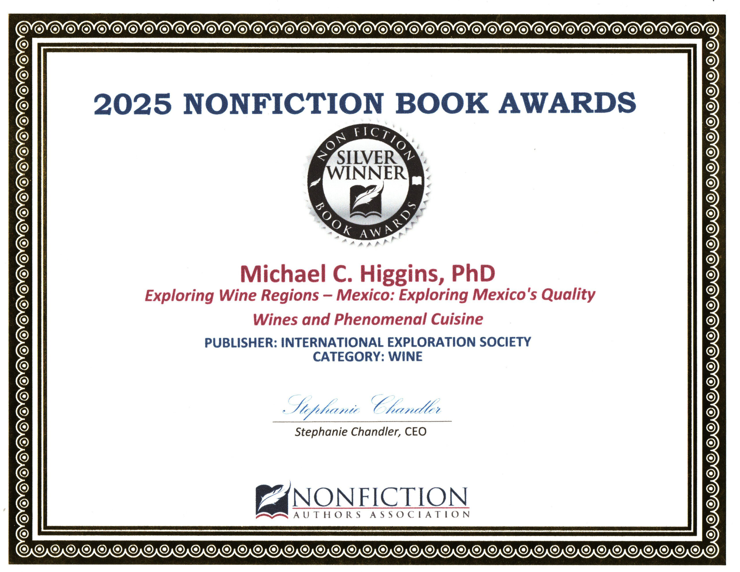 The Nonfiction Author Association (NAA) announces its 2024 Book Awards honored Exploring Wine Regions – Mexico with the Silver Medal Best Non-Fiction Book of 2024. The mission of the NAA is to provide valuable education and resources for authors of nonfiction books. Books that receive high reviews from the NAA are entered into this awards program.